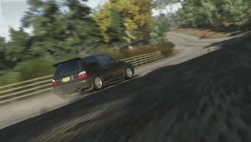 A black Nissan Pulsar GTi-R drifts on a dirt road in Forza Horizon 4, kicking up dust.