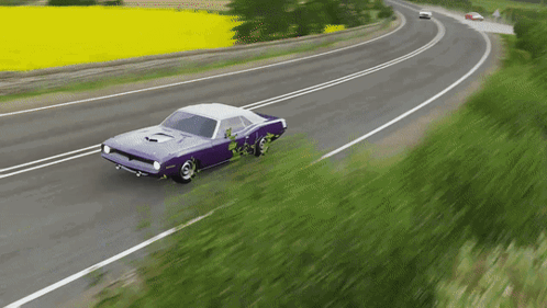 A purple Plymouth Hemi Cuda Convertible from Forza Horizon 4 drives along a scenic road.