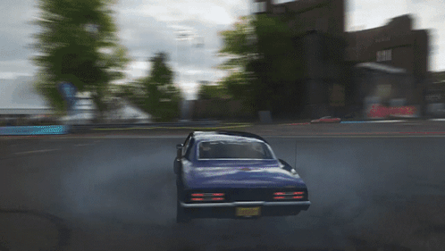 Blue Pontiac Firebird muscle car drifting and performing burnouts in Forza Horizon 4, generating smoke on the track.