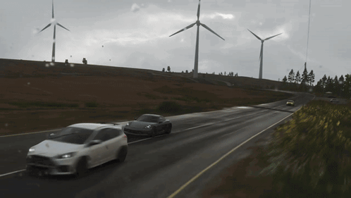 A Porsche 718 Cayman GTS drives on a road with windmills in Forza Horizon 4.