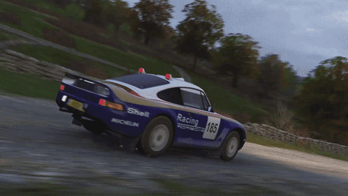 a porsche is driving down a dirt road with trees in the background