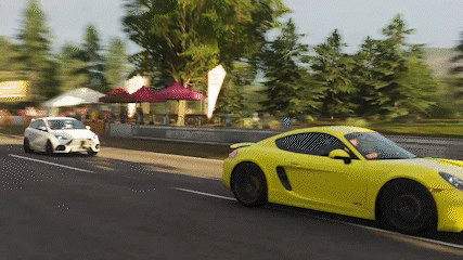 Yellow Porsche Cayman GTS racing at high speed in Forza Horizon 4, navigating a scenic road with other cars.
