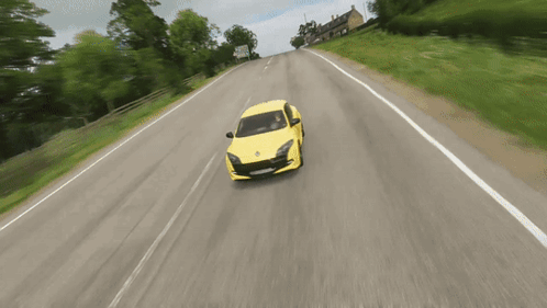 A vibrant yellow Renault Megane RS 250 drives on a scenic road in the video game Forza Horizon 4.