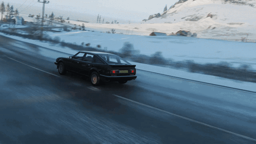 a black car is driving down a snowy road with a license plate that says ' aa ' on it