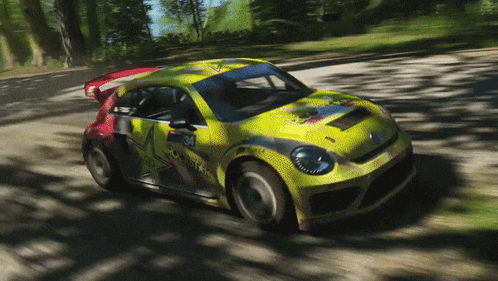 A vibrant yellow Volkswagen Global Rallycross Beetle, branded with Rockstar, races on a dirt track in Forza Horizon 4.