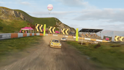 A yellow Volkswagen Global Rallycross Beetle races on a dirt track in Forza Horizon 4.