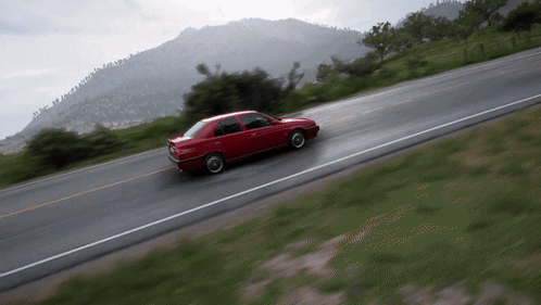 A red Alfa Romeo 155 Q4 drives dynamically on a winding road in Forza Horizon 5.