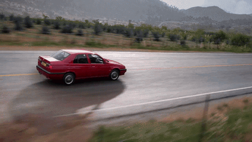 Red Alfa Romeo 155 Q4 driving on a scenic road in Forza Horizon 5, showcasing drifts.