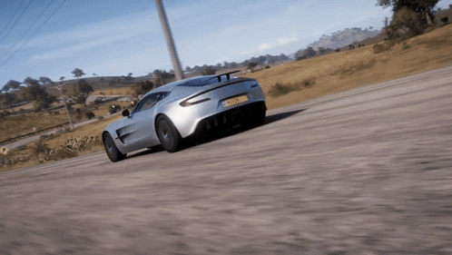 A sleek silver Aston Martin One-77 drives on a dirt road in the sunny landscape of Forza Horizon 5.