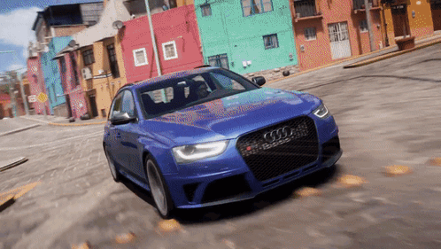A blue Audi RS 4 Avant drives through colorful city streets in Forza Horizon 5.