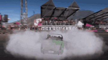 A green Austin Healey Sprite MKI performs an impressive burnout and drift on a track in Forza Horizon 5.
