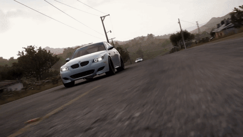 A white BMW M5 drifts and drives dynamically on a scenic road in the video game Forza Horizon 5.