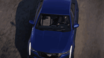 A blue Cadillac CT4-V Blackwing car drives on a winding road in Forza Horizon 5, showcasing its performance.