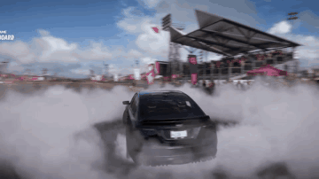 A Cadillac CT5-V Blackwing performs an impressive drift, enveloped in smoke, in front of a cheering crowd.