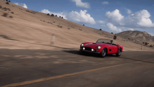 A classic red Ferrari 250 California convertible drives along a scenic desert road in Forza Horizon 5.