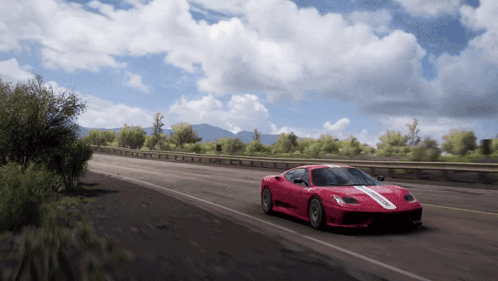 A red Ferrari 360 Challenge Stradale races through scenic roads in Forza Horizon 5.