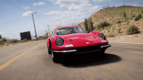 A classic red Ferrari Dino 246 GT drives through a scenic desert landscape in Forza Horizon 5.