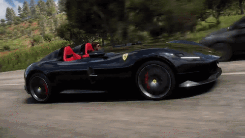 Experience the thrill of driving a black Ferrari Monza SP2 with red seats through scenic landscapes in Forza Horizon 5.