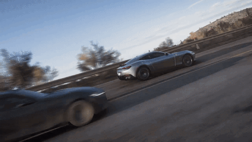 A sleek Ferrari Roma speeds along a winding road in Forza Horizon 5, showcasing dynamic driving and stunning scenery.