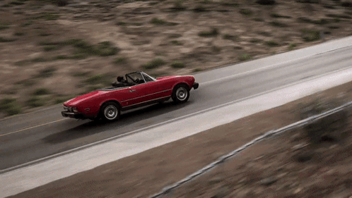 A classic red Fiat 124 Sport Spider convertible drives through a scenic desert landscape in Forza Horizon 5.