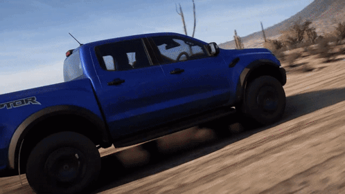 A blue Ford Ranger Raptor truck drives off-road through a desert landscape in Forza Horizon 5.