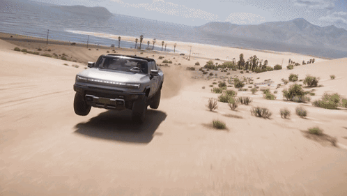 The GMC Hummer EV pickup truck drives off-road through sandy desert dunes in Forza Horizon 5.