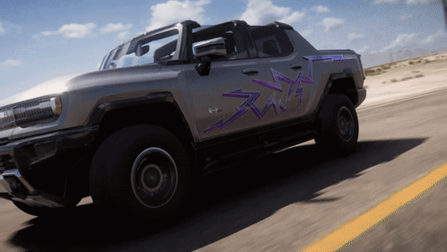 A gray GMC Hummer EV pickup truck with purple lightning decals drives through a desert landscape in Forza Horizon 5.