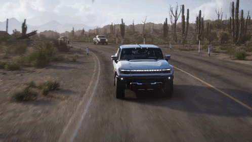 Experience the GMC Hummer EV Pickup driving through a desert highway in Forza Horizon 5.