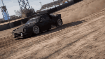 Black Hoonigan Ford RS200 Evolution rally car races on a dusty dirt track in Forza Horizon 5.