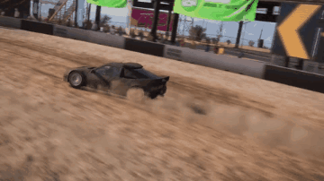 A Hoonigan Ford RS200 Evolution rally car drifts and races on a dirt track in Forza Horizon 5.