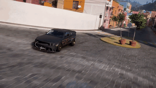 A black Hot Wheels Ford Mustang muscle car drives through a city in the video game Forza Horizon 5.