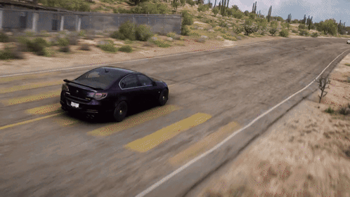 A purple HSV Gen F GTS sports sedan drives through a desert landscape in Forza Horizon 5.