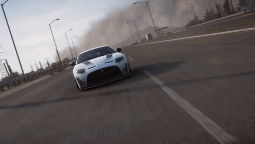 A white Jaguar XKR-S GT sports car races down a highway in Forza Horizon 5, showcasing its sleek design.