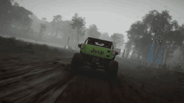 A green Jeep Trailcat races through a muddy, foggy off-road track in Forza Horizon 5.