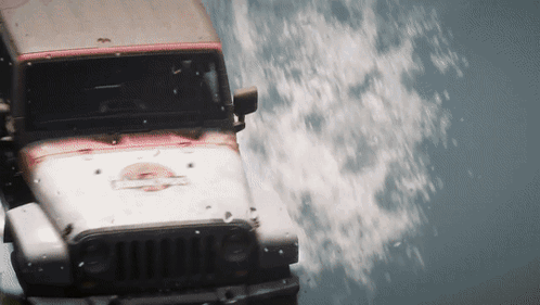 A Jurassic Park-themed Jeep Wrangler Rubicon drives through water and off-road in Forza Horizon 5.