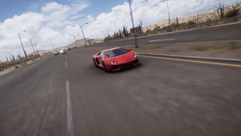 A red Lamborghini Aventador LP700-4 speeds down a desert highway in Forza Horizon 5.