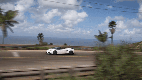 White Lamborghini Gallardo LP570-4 Spyder Performante driving on a scenic coastal road in Forza Horizon 5.