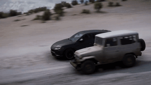 A Lamborghini Urus speeds through a desert landscape in Forza Horizon 5, kicking up dust as it drives off-road.