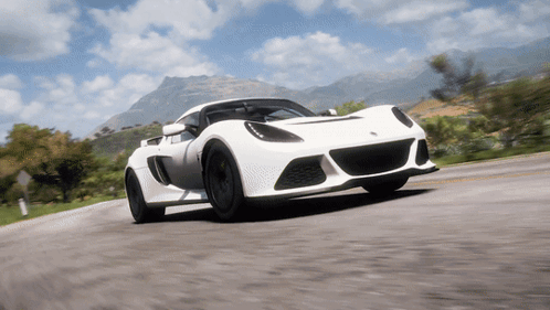 A white Lotus Exige S sports car races through scenic landscapes in Forza Horizon 5.