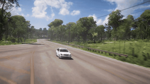a white car is driving down a road in a video game
