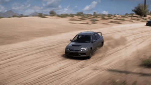 A Mitsubishi Lancer Evolution IX MR rally car drifts through a desert landscape in Forza Horizon 5, kicking up dust.