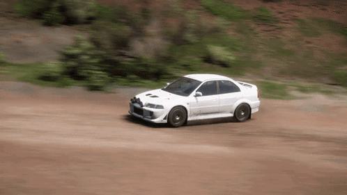 White Mitsubishi Lancer Evo VI GSR rally car driving off-road in Forza Horizon 5.