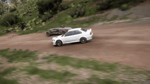 A white Mitsubishi Lancer Evolution VI GSR rally car drives off-road in Forza Horizon 5.