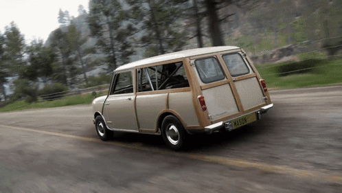 Driving the classic Morris Mini Traveller through scenic roads in Forza Horizon 5.