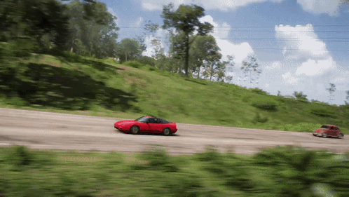 A red Nissan 240sx SE drives through a scenic, tree-lined road in Forza Horizon 5.