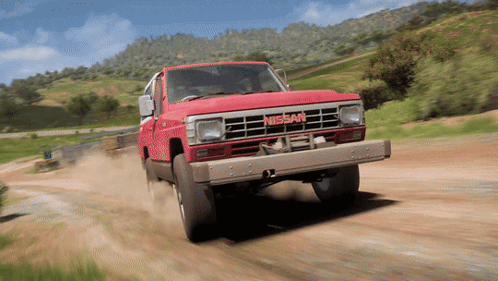 A red Nissan Safari Turbo SUV drives off-road through a scenic, hilly landscape in Forza Horizon 5.