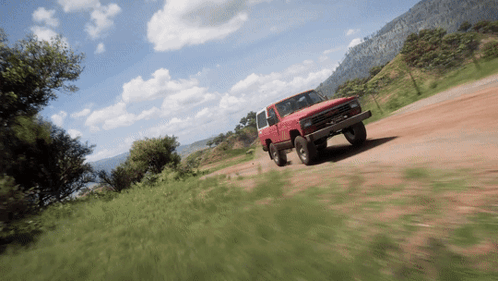 Red Nissan Safari Turbo off-roading on a dirt path in Forza Horizon 5, kicking up dust in a sunny landscape.