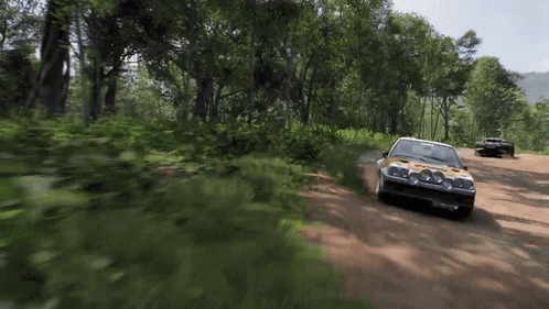 An Opel Manta 400 rally car drifts on a dirt road in Forza Horizon 5, kicking up dust.