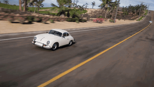 A classic white Porsche 356 A 1600 Super drives on a desert road in Forza Horizon 5.