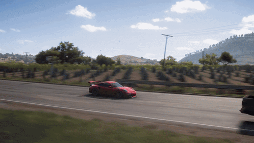 A red Porsche 911 GT3 RS races through scenic roads in the video game Forza Horizon 5.